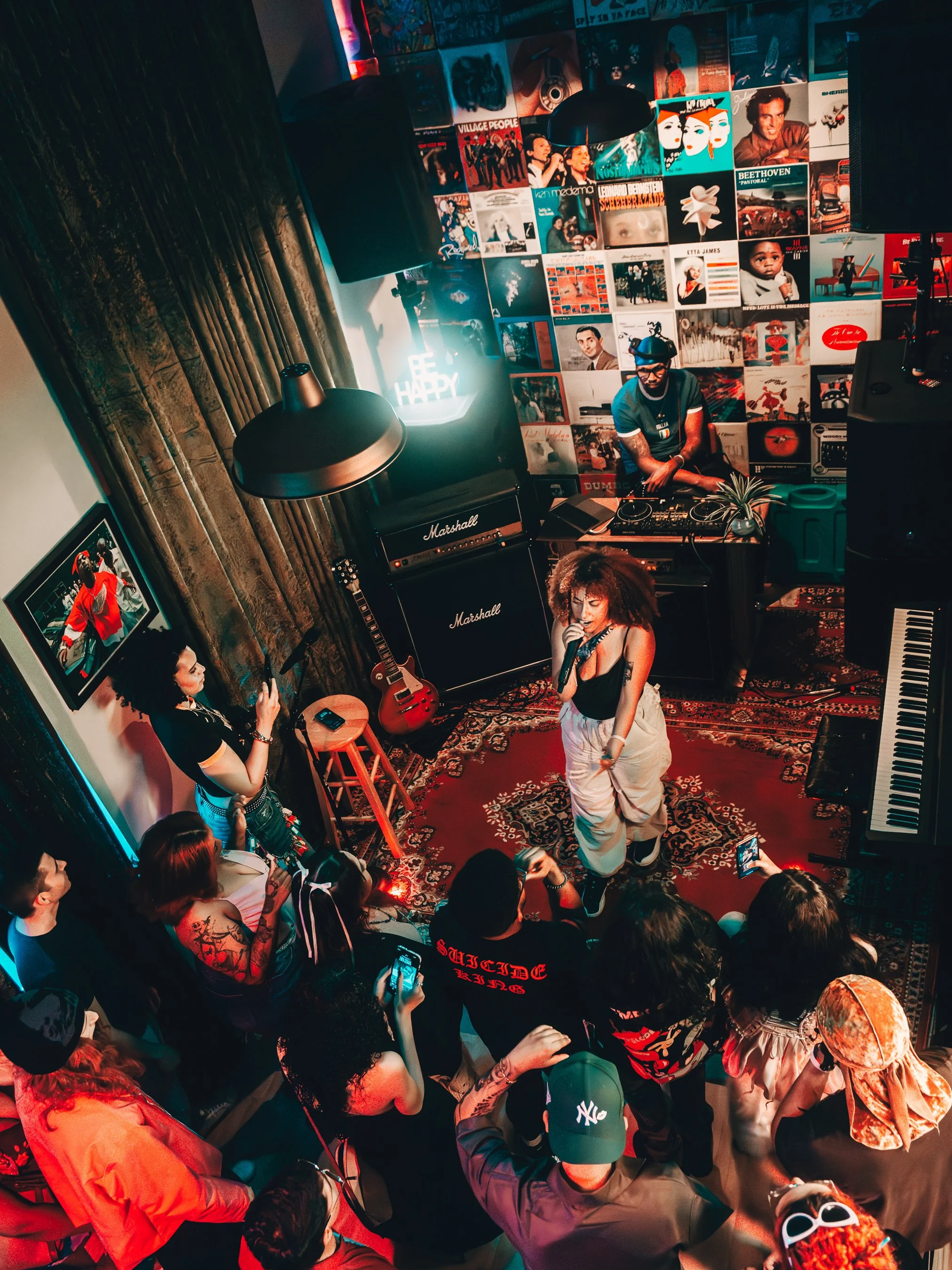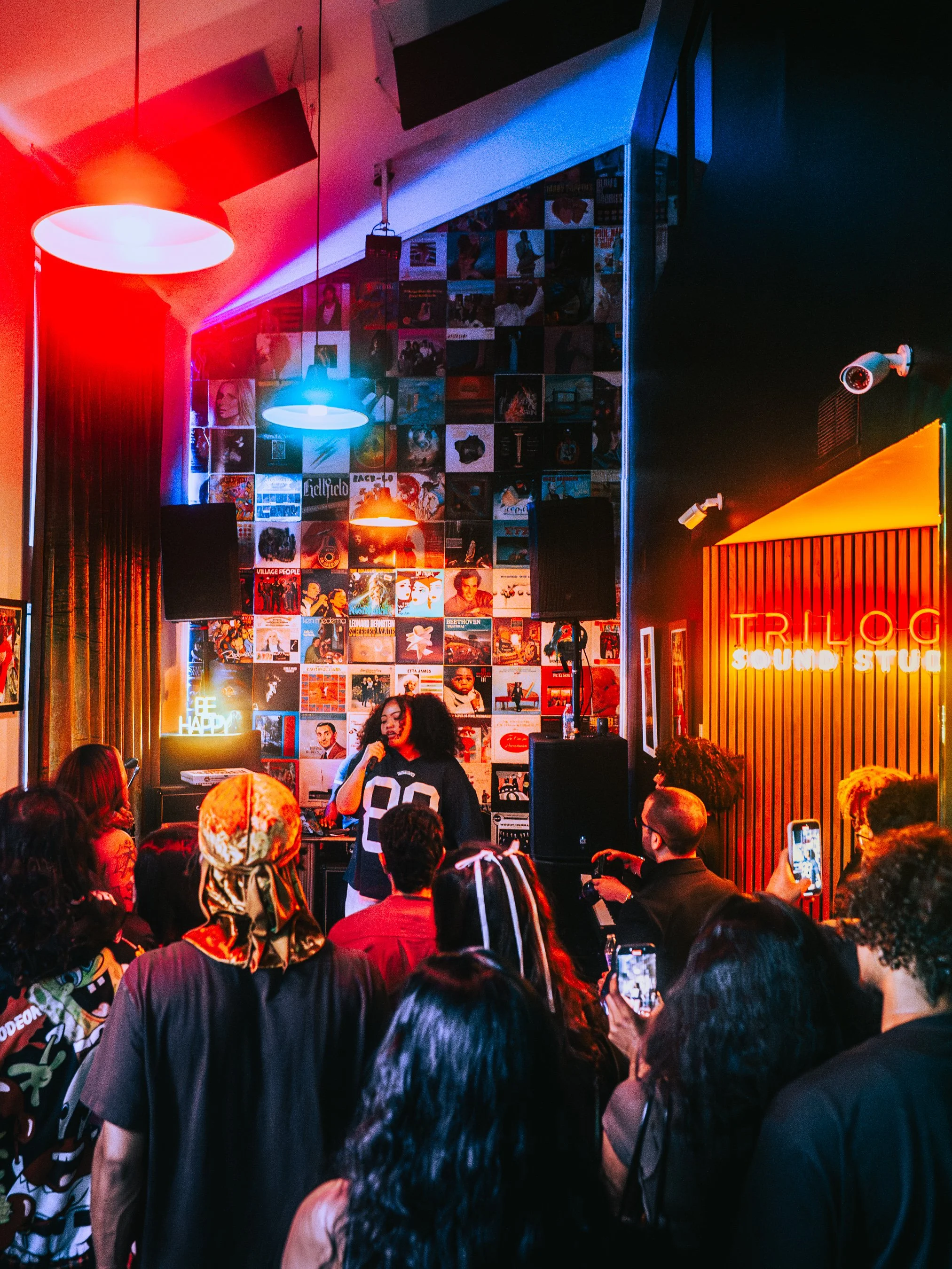 A woman performs singing on a small stage in a music lounge with an audience taking pictures, surrounded by records and music equipment.