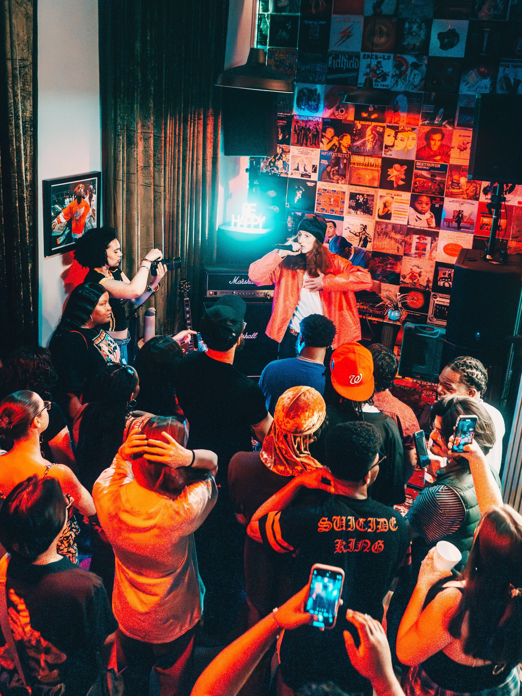 A woman performing with a microphone on stage at a music venue, surrounded by a crowd of young people dancing and enjoying the performance. The background features a collage of vintage posters and a neon sign that reads 'BE HAPPY'.
