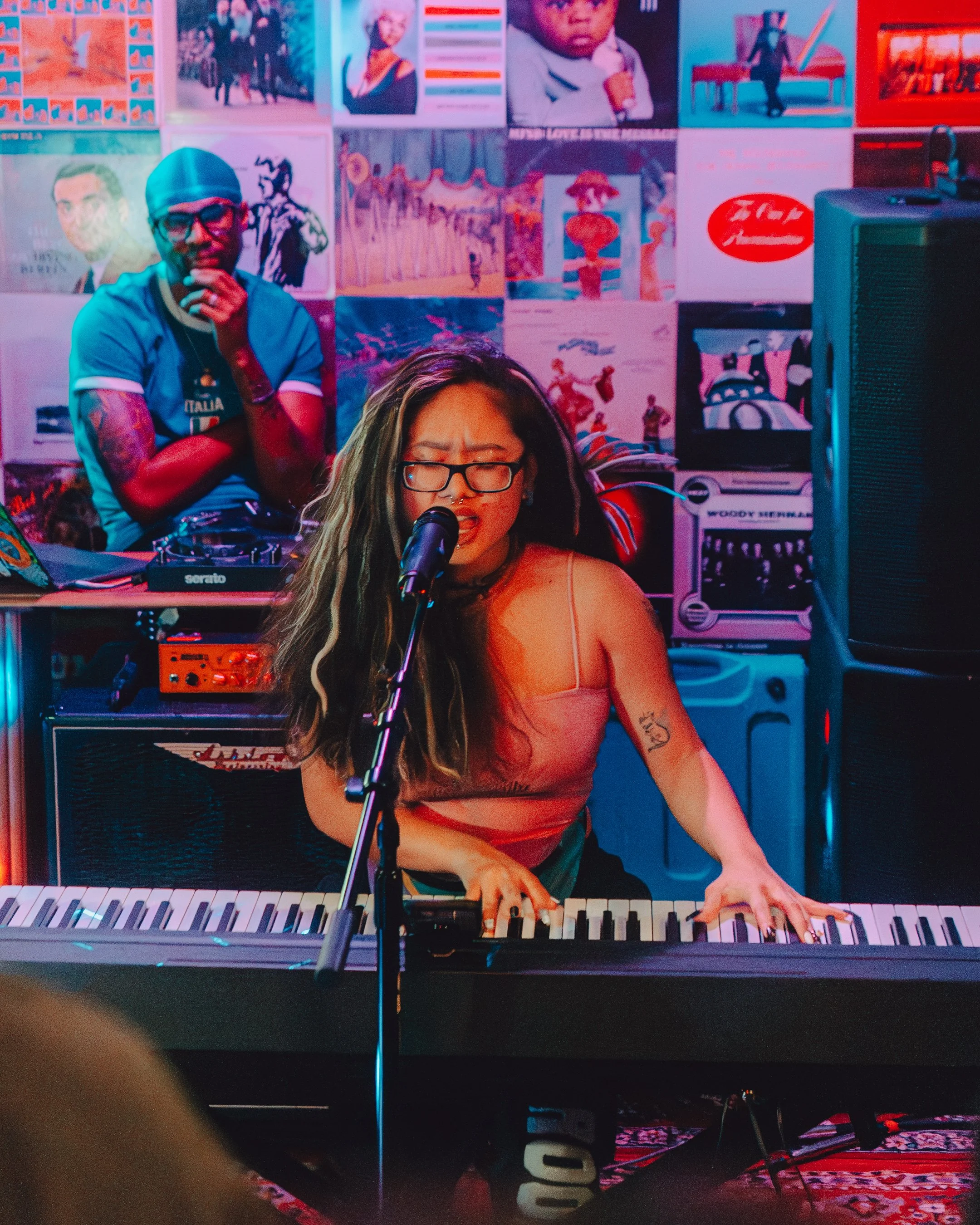 A woman plays a keyboard and sings into a microphone while a DJ stands behind her in a colorful room decorated with posters.