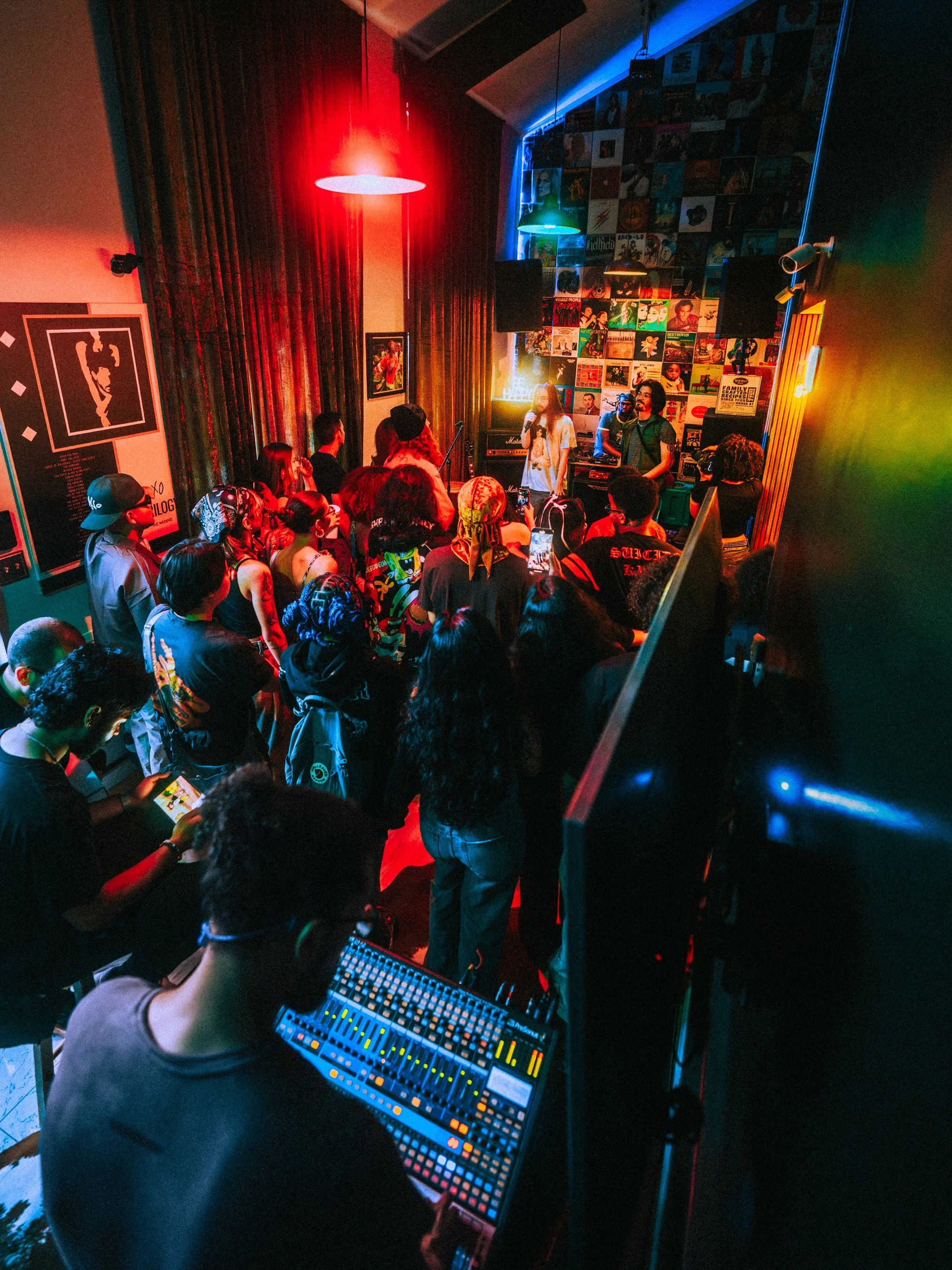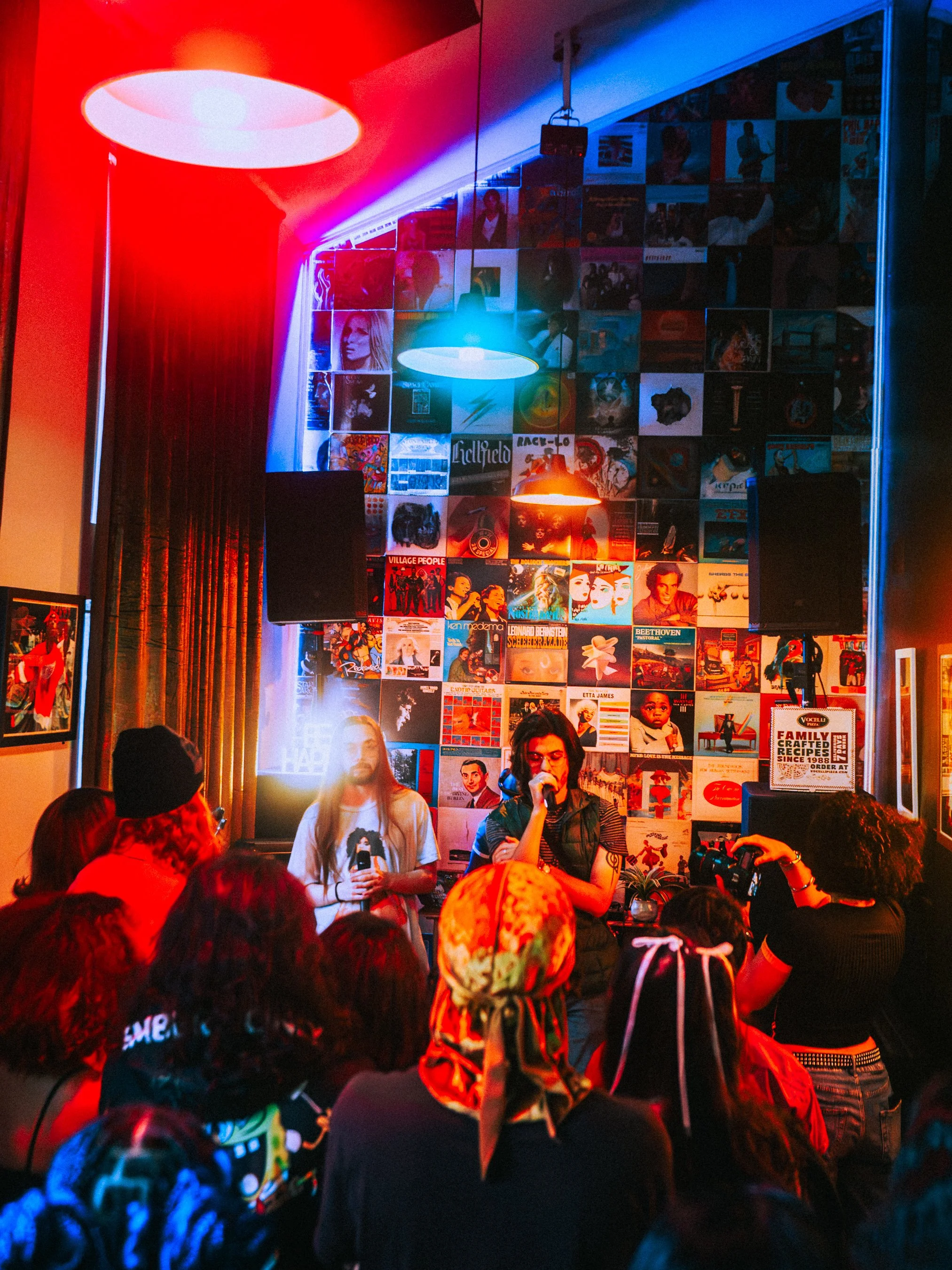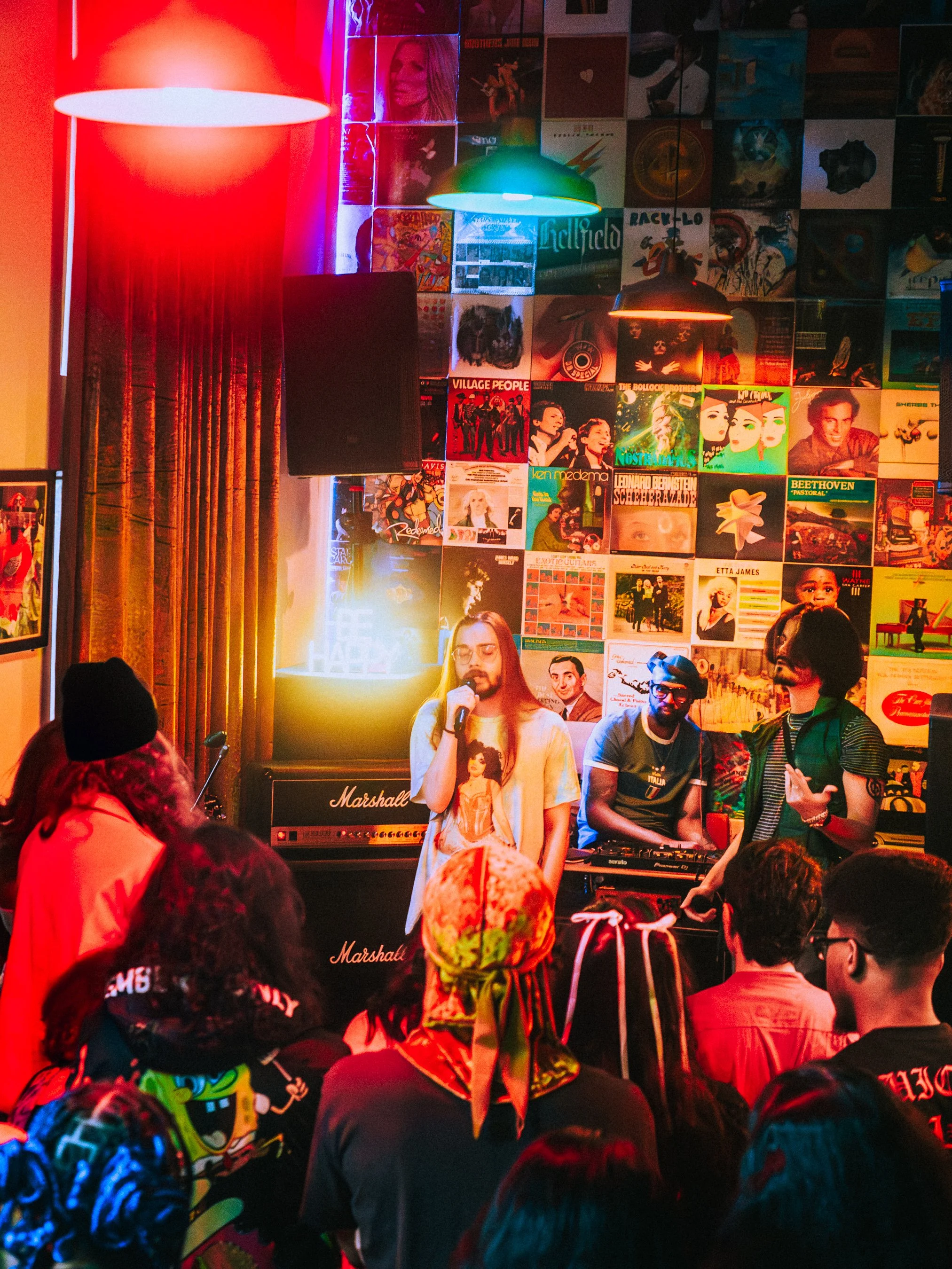 A singer and a woman with a microphone perform in front of a small audience inside a room decorated with vinyl record album covers on the wall, with colorful red, blue, and purple lighting.