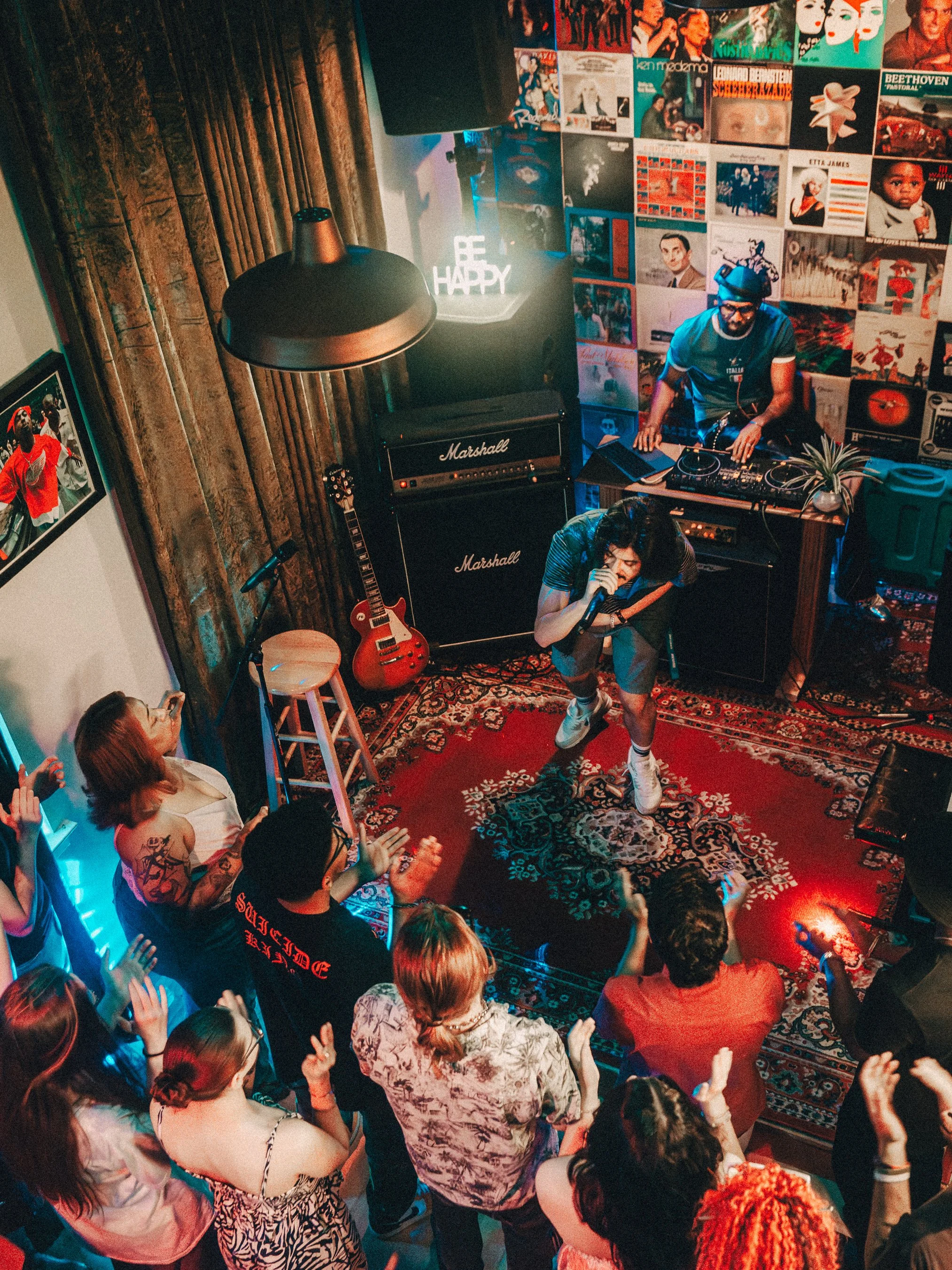 A lively indoor concert with a male singer on a small stage, surrounded by a cheering crowd, a DJ with turntables, and a wall decorated with posters and artwork.