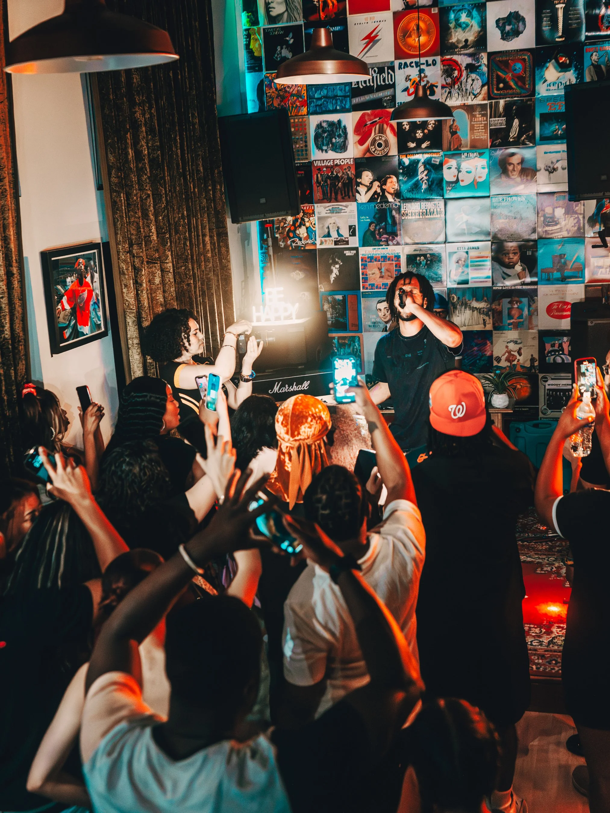 Singer performing with microphone in a room decorated with album covers, surrounded by people taking photos or videos.