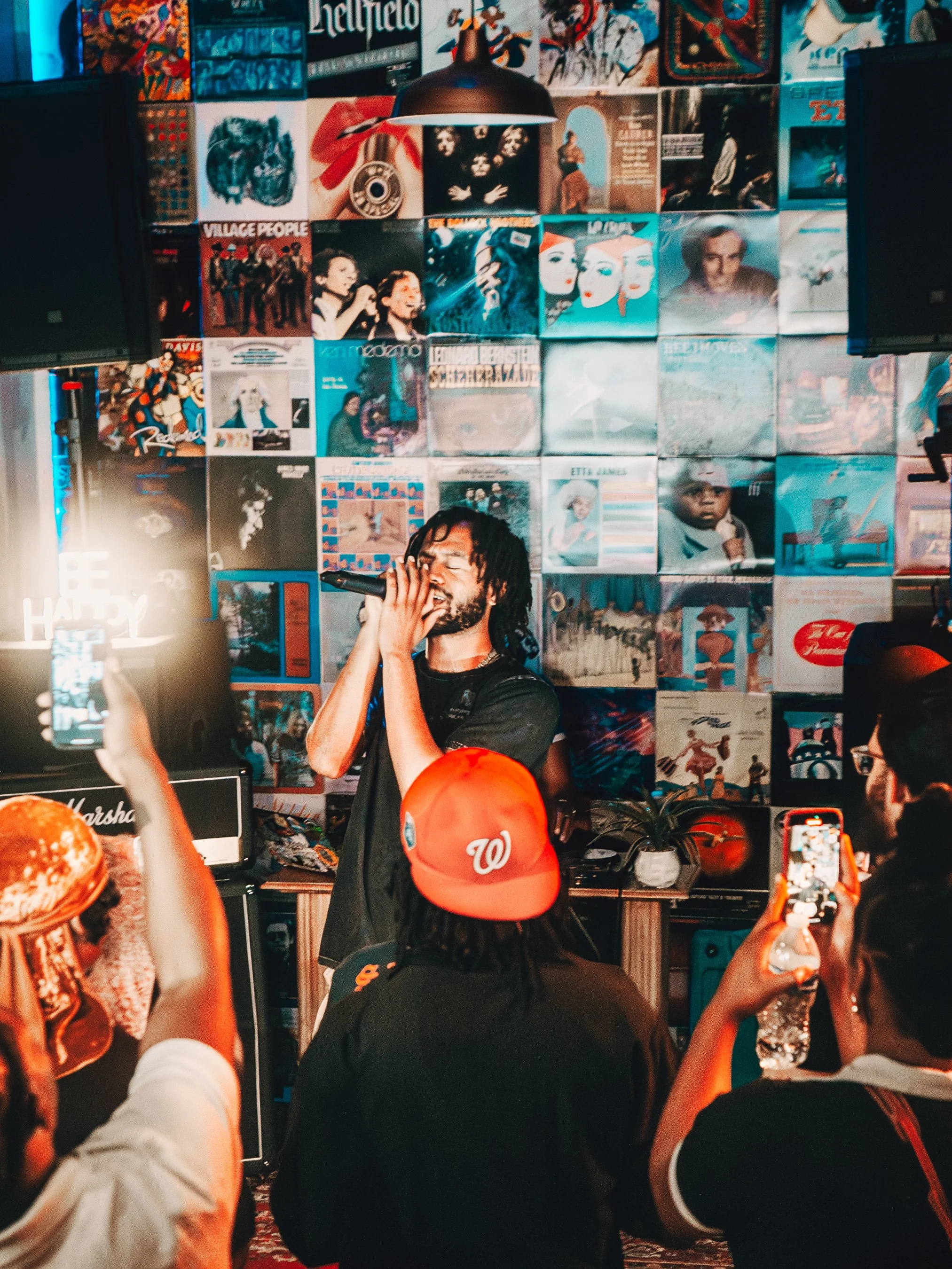 A live music event with a singer on stage performing passionately to an audience in a dimly lit, decorated room with vinyl record covers on the wall.
